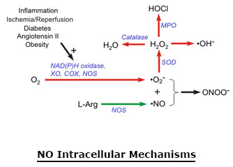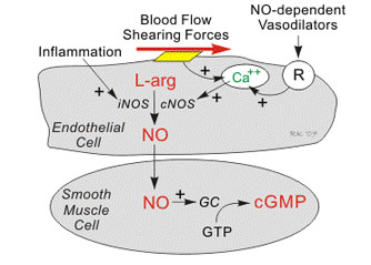 Nitric oxide, known as the 'endothelium-derived relaxing factor', or 'EDRF', is biosynthesized endogenously from L-arginine, oxygen and NADPH by various nitric oxide synthase (NOS) enzymes. Dr. Richard E. Klabunde explains the synthesis of nitric oxide from the amino acid L-arginine by the enzymatic action of nitric oxide synthase (NOS). There are two endothelial forms of NOS: constitutive NOS (cNOS; type III) and inducible NOS (iNOS; type II). In addition to endothelial NOS, there is a neural NOS (nNOS; type I) that serves as a transmitter in the brain and in different nerves of the peripheral nervous system, such as non-adrenergic, non-cholinergic (NANC) autonomic nerves that innervate penile erectile tissues and other specialized tissues in the body to produce vasodilation.