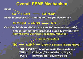 The above studies demonstrate that PEMF therapy affects many transduction pathways and, in particular the Ca/CaM-dependent nitric oxide cascades. The CaM dependent cascades are involved in tissue repair. By modulating the calcium-binding kinetics to calmodulin (intracellular Ca2+/CaM), the endothelial and neuronal nitric oxide synthase isoforms (respectively eNOS and nNOS) produce nitric oxide in short bursts that can immediately relax blood and lymph vessels. As a highly reactive gaseous molecule, nitric oxide makes an ideal transient paracrine (between adjacent cells) and autocrine (within a single cell) signaling molecule that has direct and indirect vascular action, including the following: